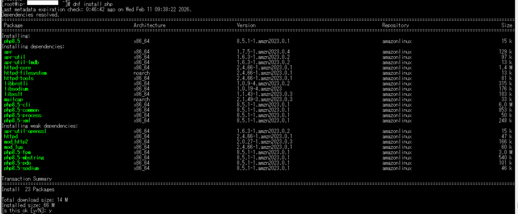 以下のコマンドを実行してAmazon Linux 2023にPHPをインストールしました。