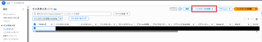 AWSまずはAWSにログインして、EC2のインスタンスの一覧を確認します。削除したいインスタンスを選択した状態で、「インスタンスの状態」をクリックします。