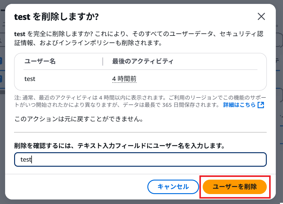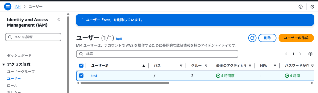 ボタンを押下すると「ユーザー『test』を削除しています」と表示されます。