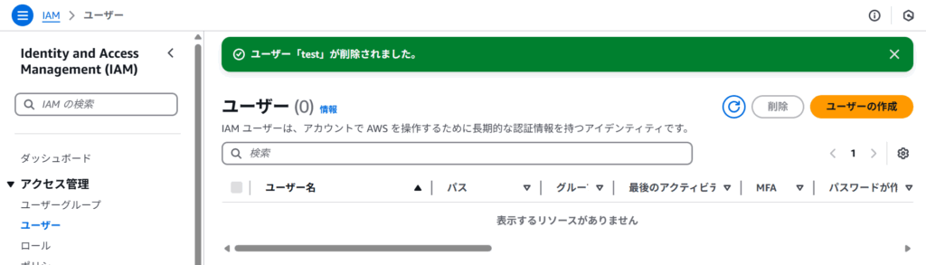 削除処理が完了すると「ユーザー『test』が削除されました。」と表示されます。