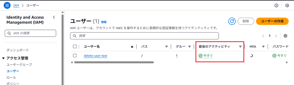 IAMのアクセス管理>ユーザーへアクセスして「最後のアクティビティ」からIAMユーザーの使用履歴を確認します。使われた直後のユーザーは「今すぐ」と表記されます。