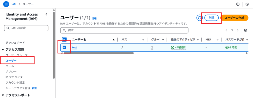IAMからユーザーペインを選択し、ユーザーを削除する