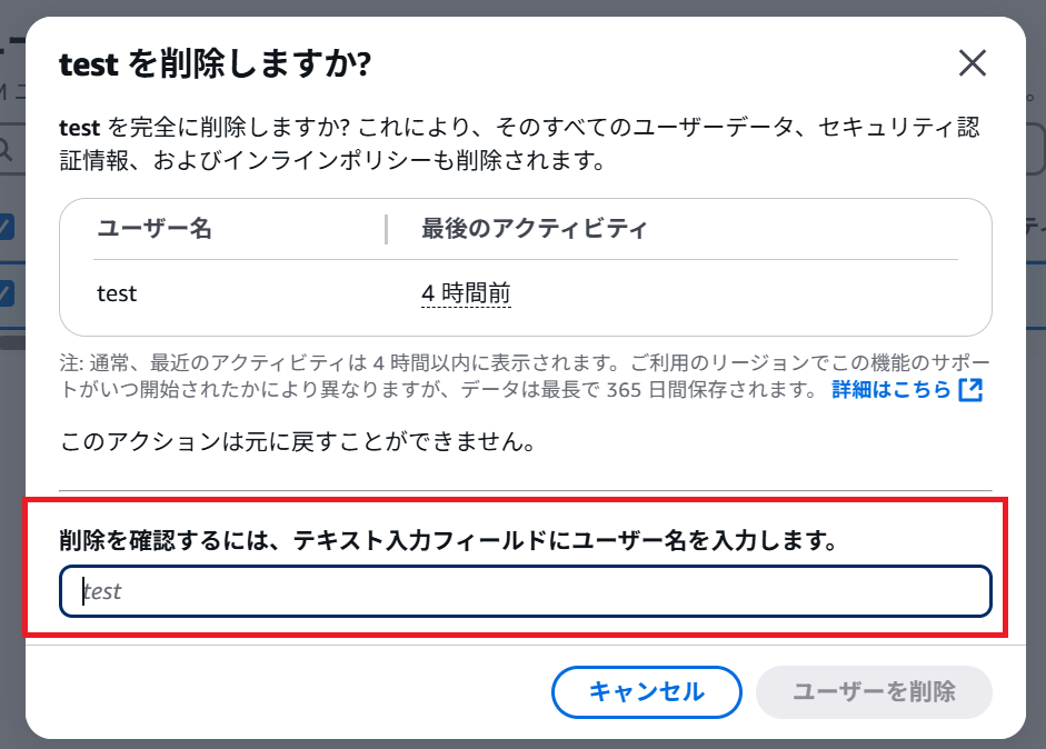 ユーザー名を入力すると「ユーザーを削除」ボタンが有効化されます。