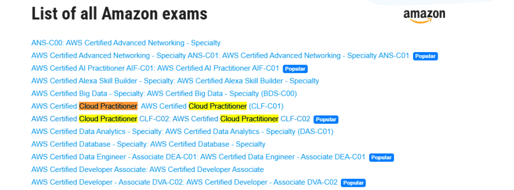今回はAWSクラウドプラクティショナーを目標にしてみます。Popular exams>Amazonをクリックします。