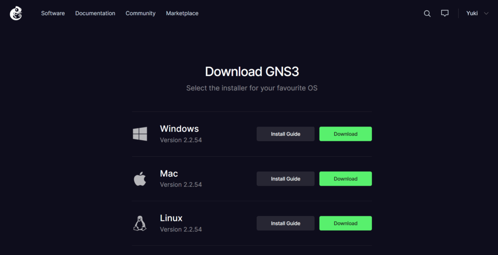 GNS3公式サイトにアカウントを登録してログインしたら、以下のページへアクセスして自分の使っているパソコンのOSに対応しているGNS3のインストーラをダウンロードします。