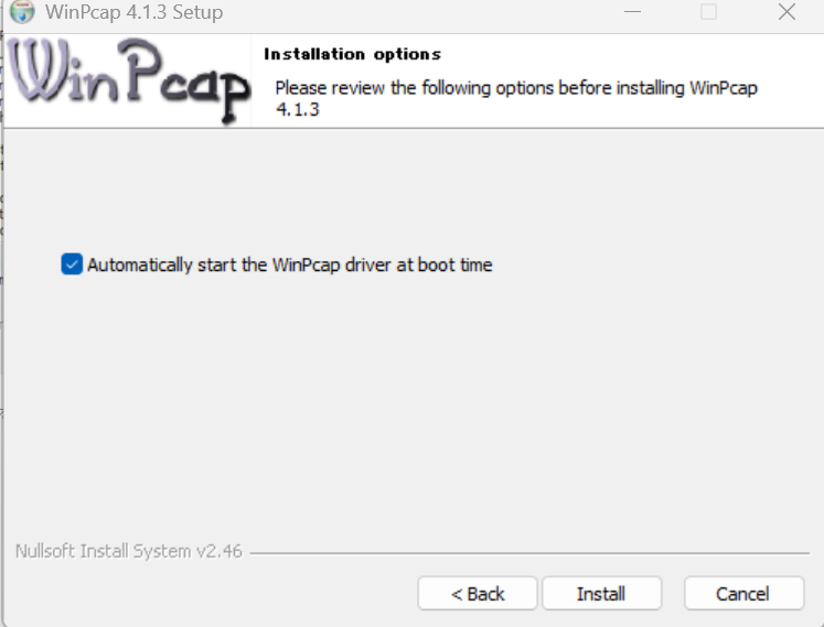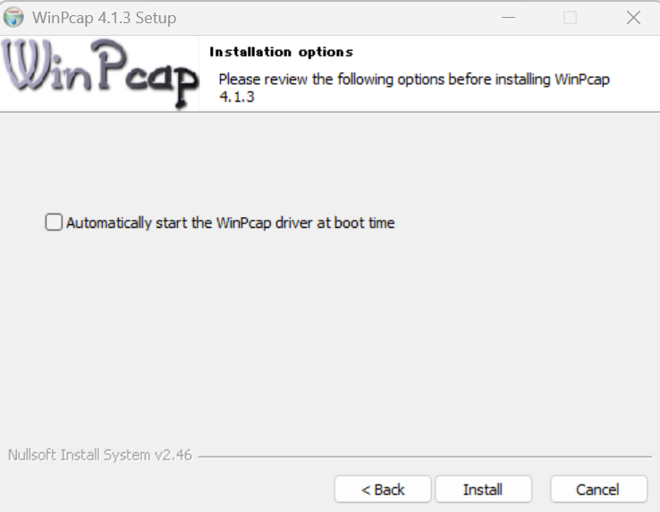チェックは外しておきます。チェックがついているとOSの起動時に自動でWinPcapドライバーが起動します。