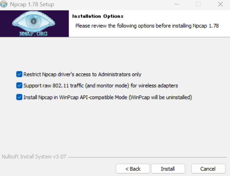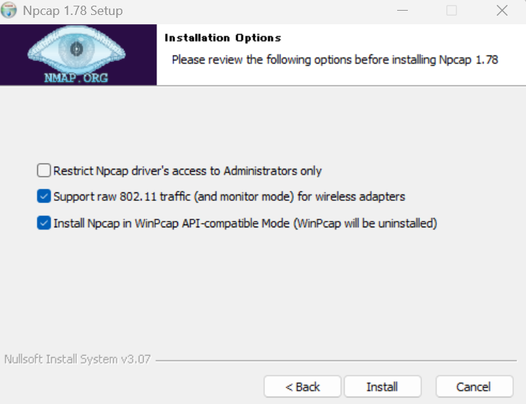 一番上にチェックを入れてAdministratorsグループに入っているWindowsのユーザーでしかNpcapを使えないようにします。