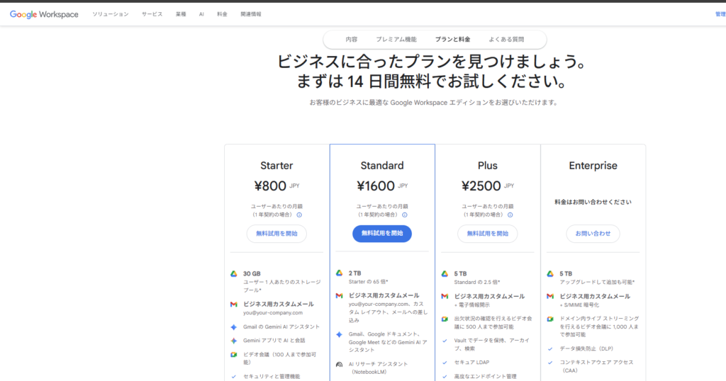 Google Workspaceは2026年2月現在、月額800円から利用できます。