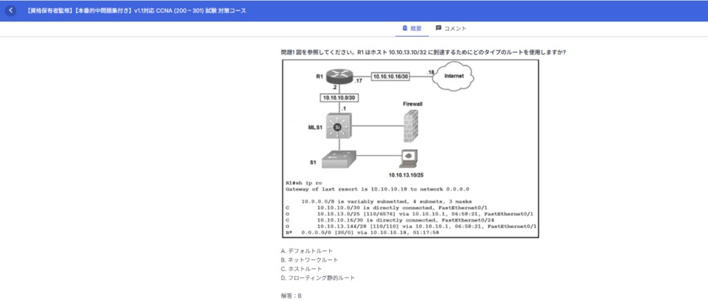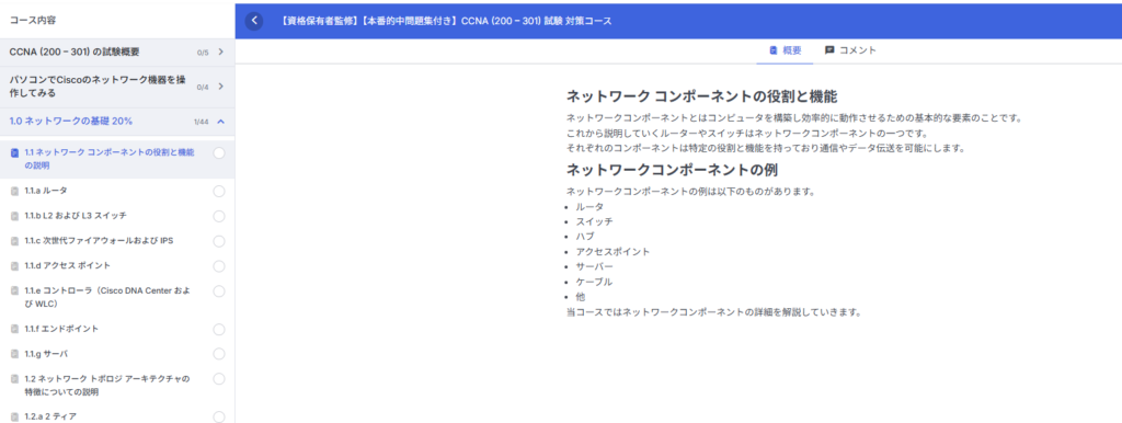 CCNAの模擬試験を提供しているため、問題とその解説の理解ができるよう、コースを構築しているため問題と解答を理解します。