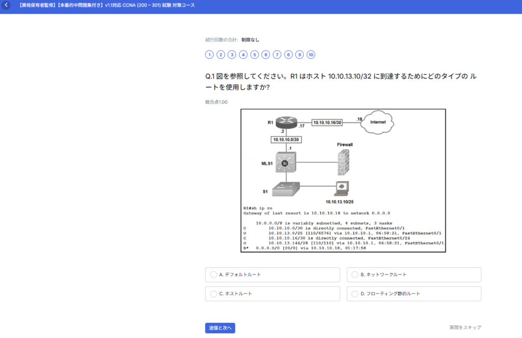 WIジャパンで提供しているCCNAの対策コースでは、本番のCCNAさながらの問題を提供しています。また、CCNAの出題範囲に指定されている技術についても詳細を解説しています。