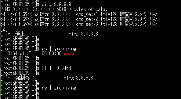 Ctrl+Zで停止した場合は、ジョブが停止しているがプロセスは起動したままになるので、今操作しているユーザーでログインしたままの状態で意図的にプロセスを停止したい場合はpsコマンドでプロセスを確認してkillコマンドでプロセスを終了します。