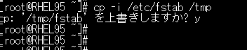 -iオプションをつけると、ファイルのコピー先にファイルがある際に上書きするかどうかを確認することができます。yを入力してEnterを押下すると上書きします。
