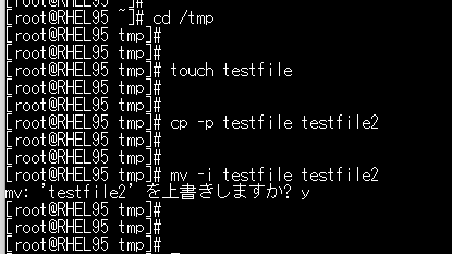 以下の例では、cdコマンドで/tmpに移動し、touchコマンドでテストファイルを作成し、cpコマンドでそれを複製したうえでmvコマンドに-iオプションをつけた際の動作を確認しています。