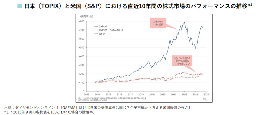 アメリカ合衆国の経済はここ最近著しいものがあります。経済産業省が公開している経済的な分析では、「GAFAMを除くと、日米の経済成長に大差はない」と書かれています。アメリカ合衆国の経済成長の要因は、主にIT企業、具体的にはGAFAと呼ばれる企業の経済的影響が大きいということが読み取れます。