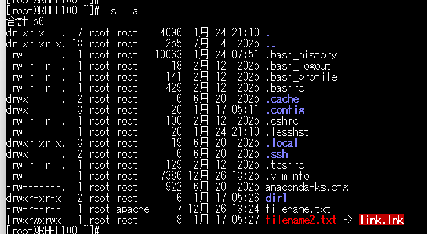 例えば以下の画像の例では、ほとんどのファイルが root rootになっていますが、左側のrootの記載がユーザーで、右側のrootがユーザーグループです。