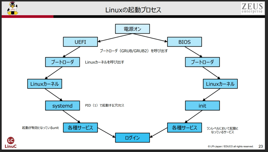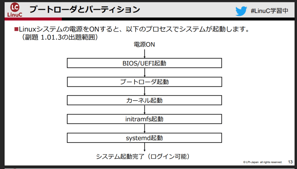 LinuCレベル2 201試験の出題範囲「2.01.1 ブートプロセスとGRUB」の技術的内容の解説をまとめました。