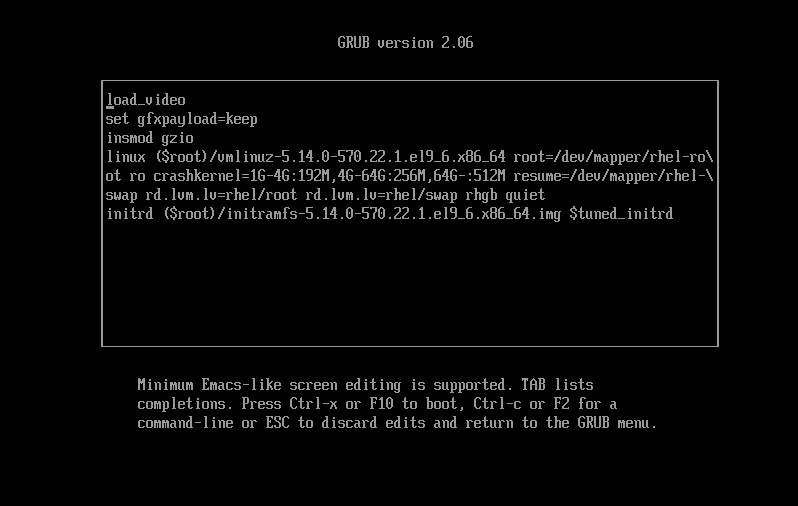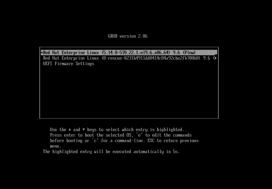 以下はRed Hat Enterprise Linux 9.6の起動画面です。この画面でcキーを押下します。