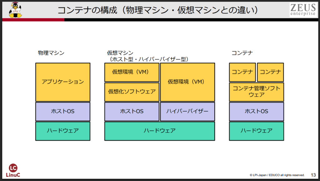 コンテナの構成(物理マシン、仮想マシン、コンテナの特徴)