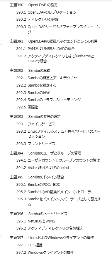 以下のLinuCレベル3 300試験の出題範囲を確認するとわかりますが、Sambaが大部分を占め、Samba以外ではOpenLDAPが出題範囲になっています。
