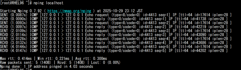 RHEL9.6 でlocalhostにnpingコマンドを実行した実行結果を掲載します。
