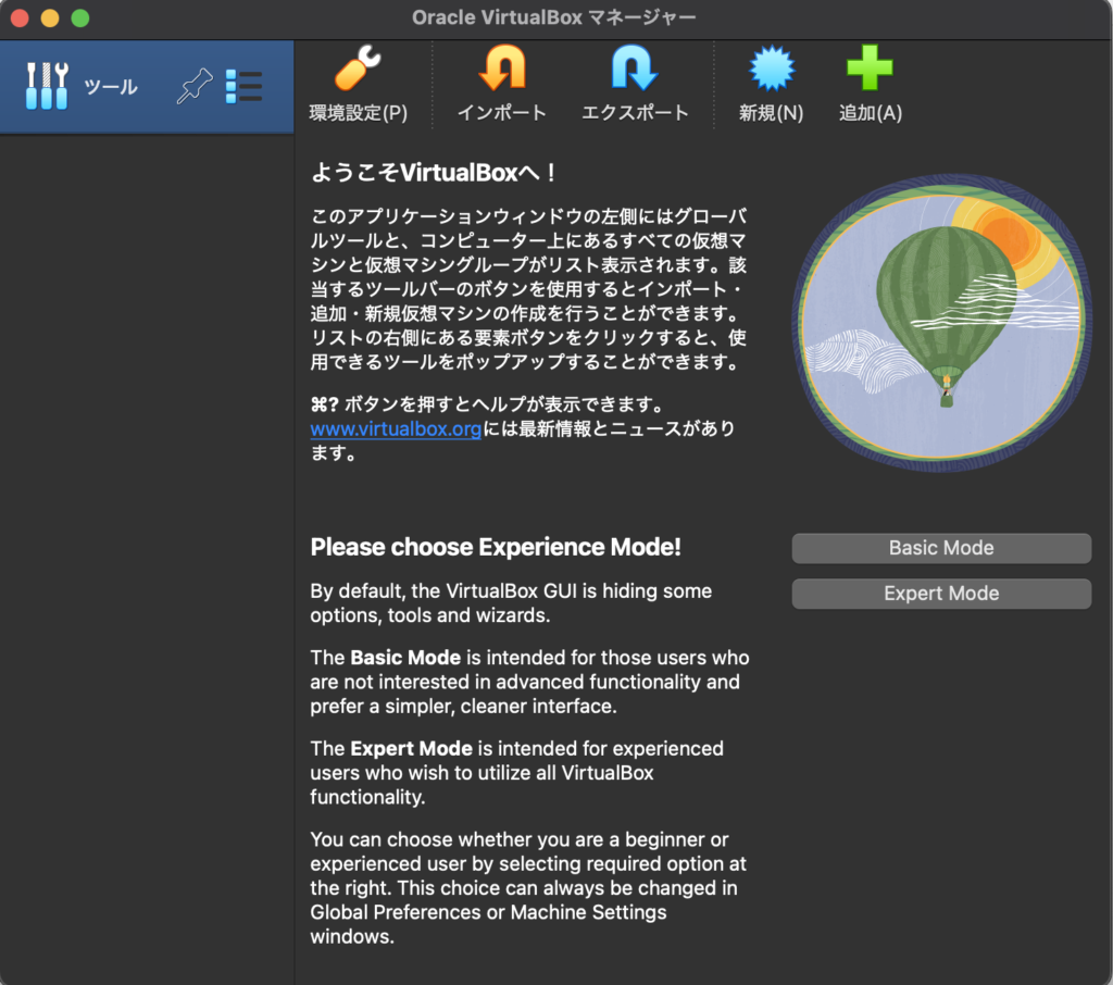 インストールが完了したとの表示が出たら、VirtualBoxを起動してみます。