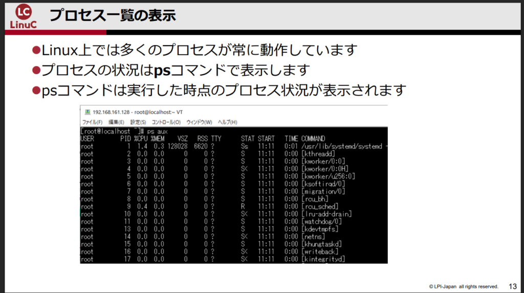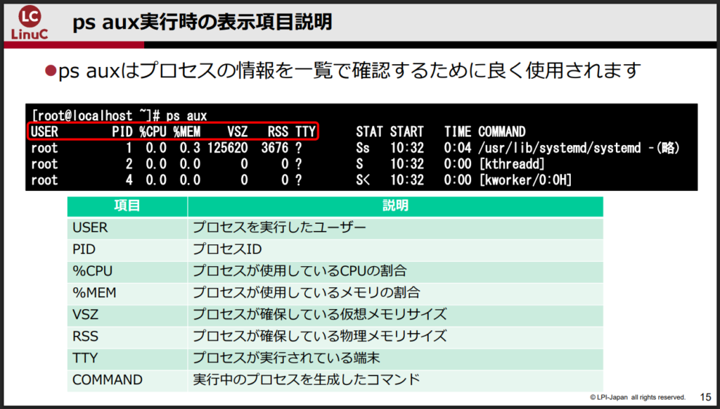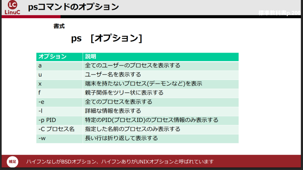 LinuCレベル1の公式資料でもpsコマンドのオプションについて解説されています。
