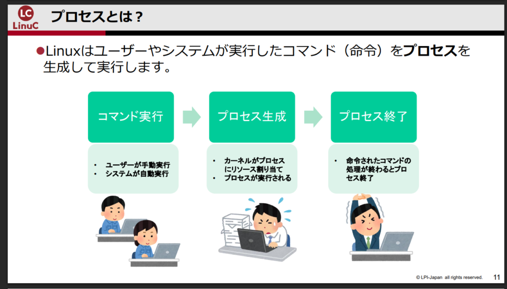 そもそもプロセスについて説明すると、Linuxはユーザーやシステムが実行したコマンドを「プロセス」を生成することで実行しています。