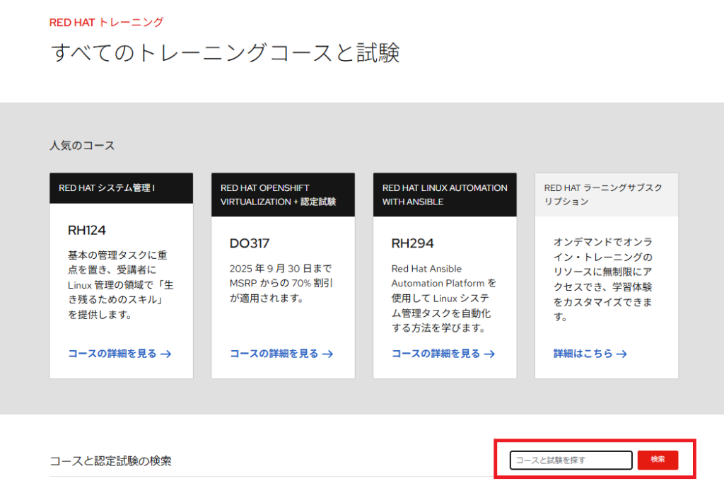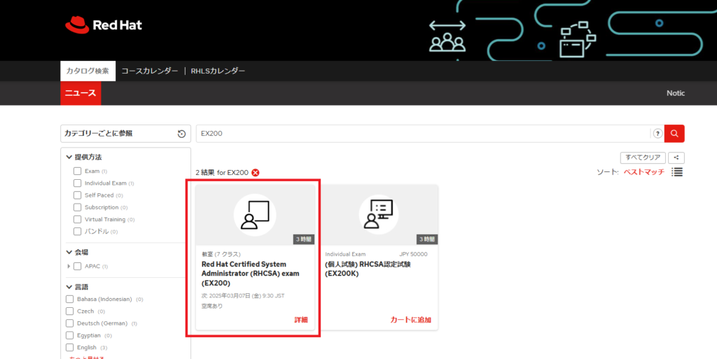 コースト試験を探すというテキストボックスに「EX200」と入力して「RHCSA 認定試験 (EX200) 」を見つけます。