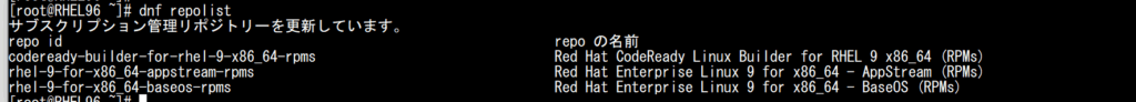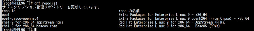 Red Hat Enterprise Linux 9.6で作業を実施しますが、作業実施前に現在のリポジトリの有効状態を確認します。