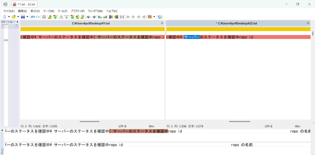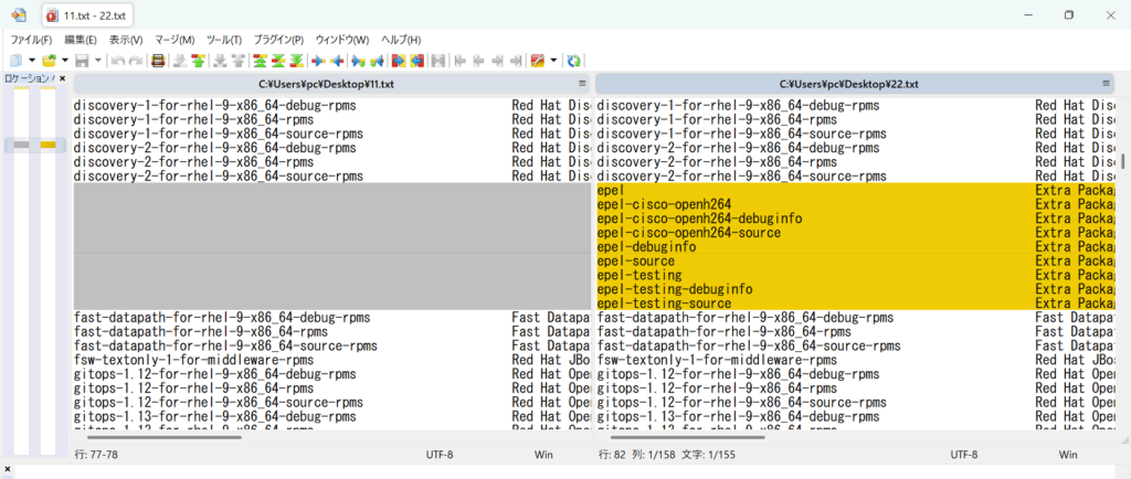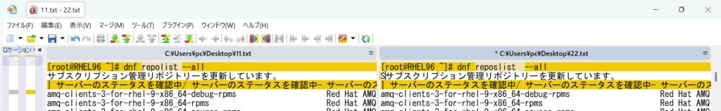 今回はこちらの–allをつけて実行したコマンドの実行結果を作業の前後をWinmergeで確認してみます。作業前後のdnf repolist –allコマンドの実行結果比較は以下の差分でした。
