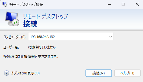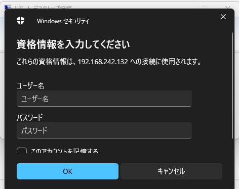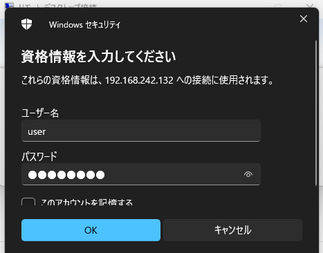 リモートデスクトップ接続したら、先ほどの設定画面でLogin Detailに書いてあったユーザー情報でログインします。