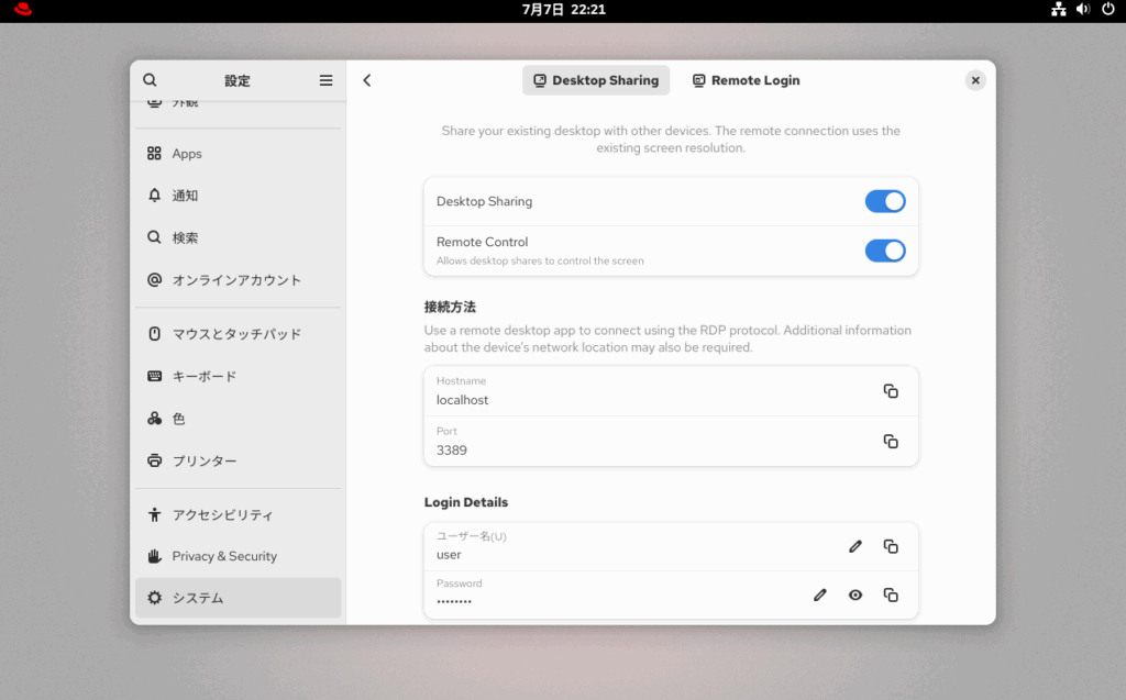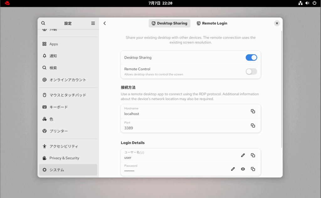 GNOME(RHEL10.0のGUIのデスクトップの画面)からリモートデスクトップ接続を許可する