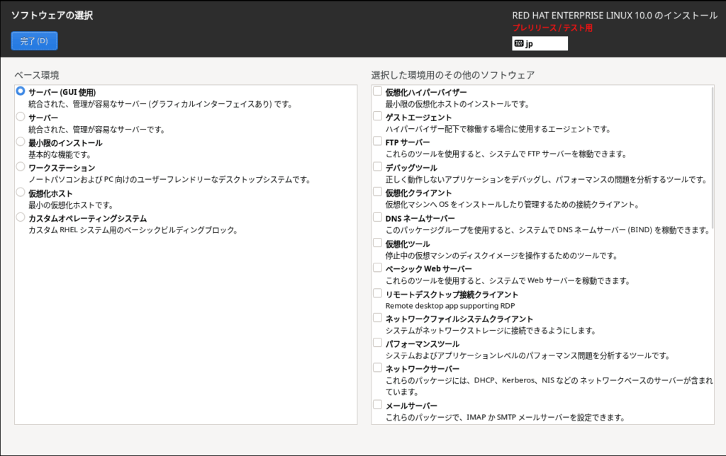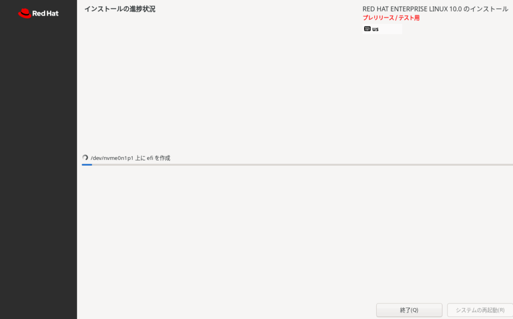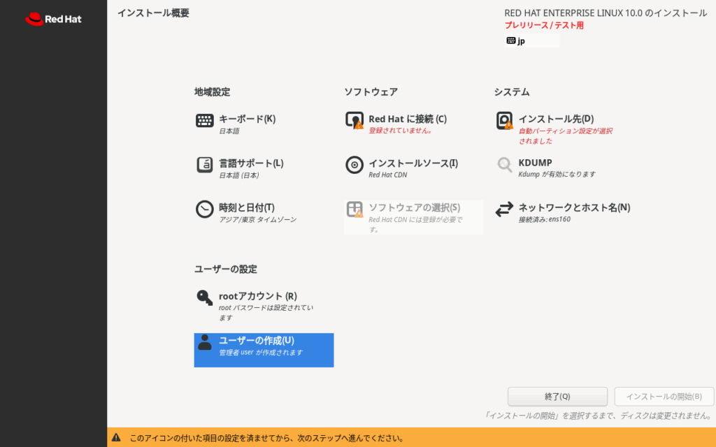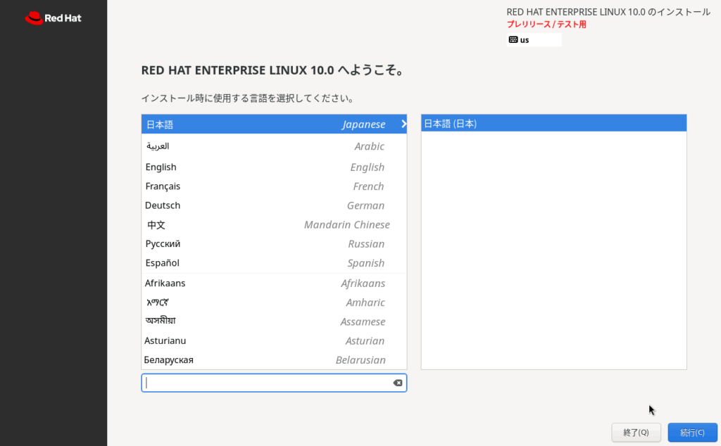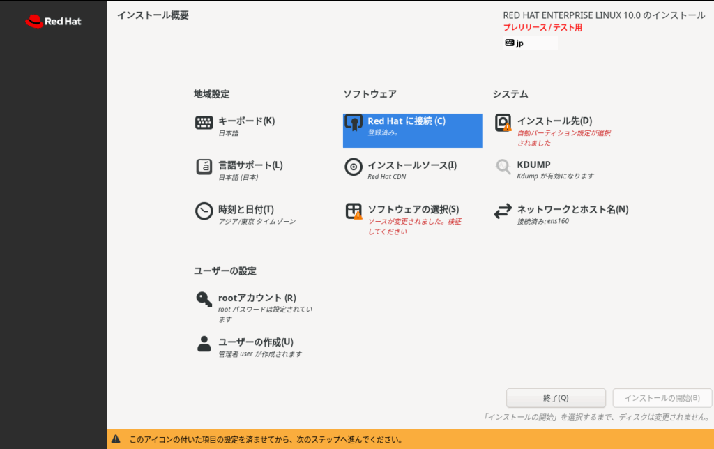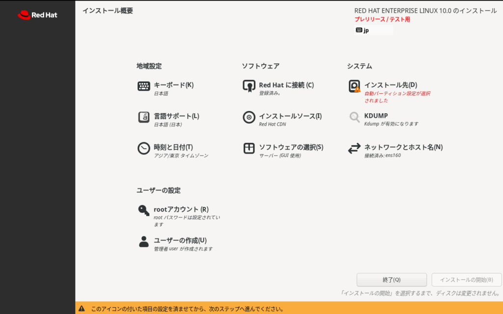 isoファイルダウンロード後、VM wareworkstationにRHEL10 betaをインストールしています。