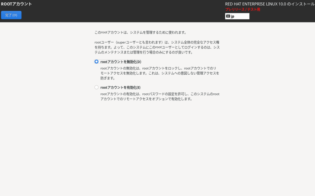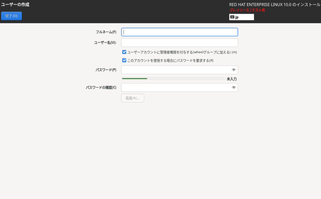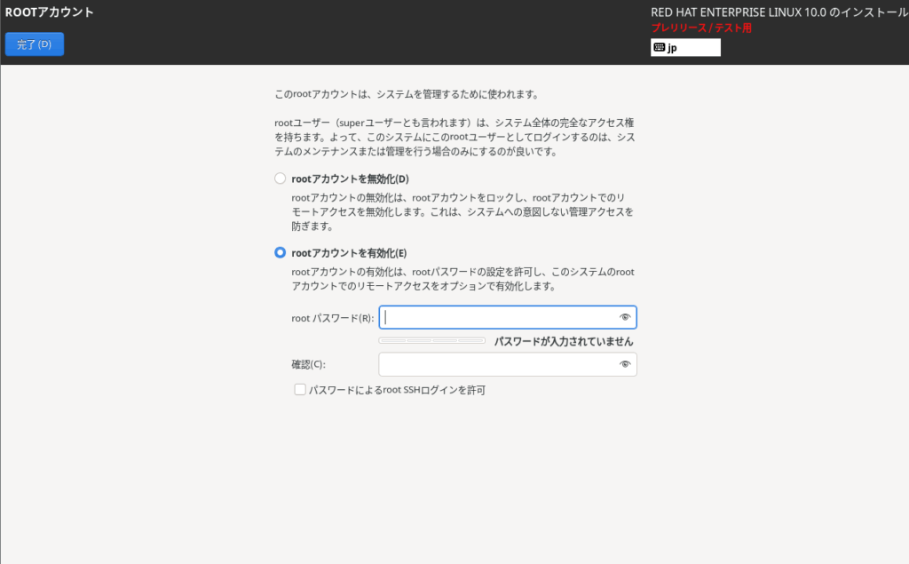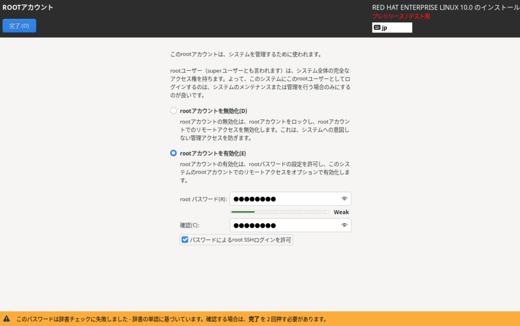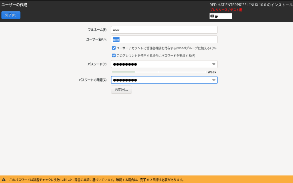 パスワードが難解なものではないため下に警告が表示されましたが、本環境ではそれほど考慮しないため、完了ボタンを2回押してこのまま次に進みます。