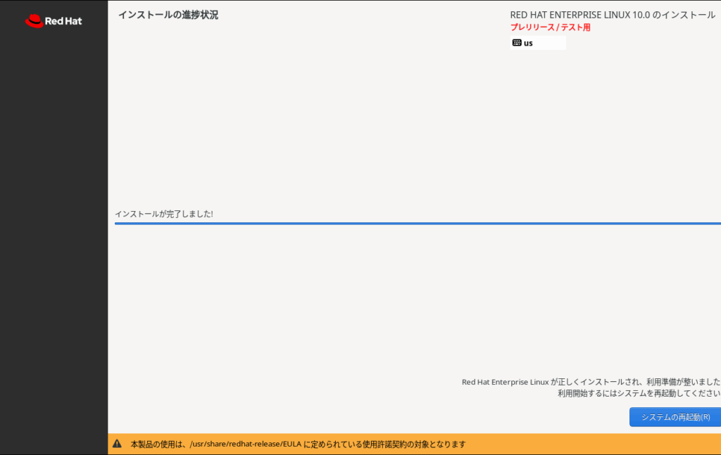 インストールが完了したので、システムの再起動を実施します。