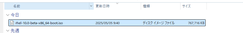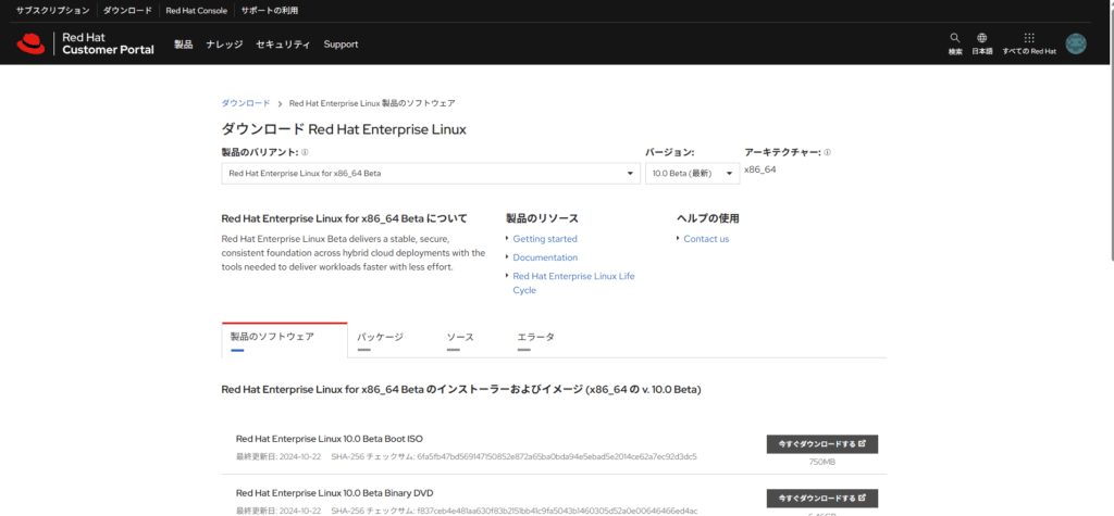 以下のURLへアクセスし、RHEL10 betaのisoファイルを入手します。