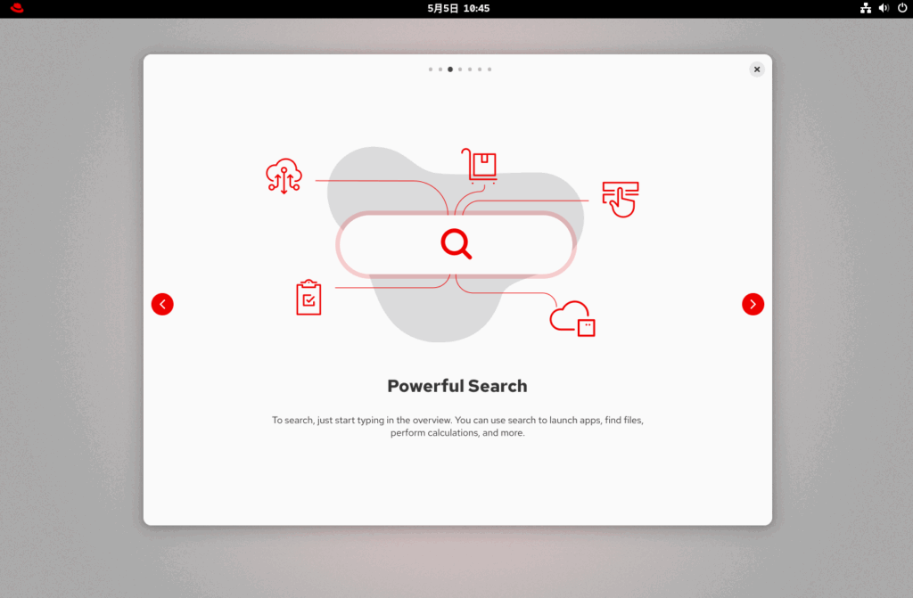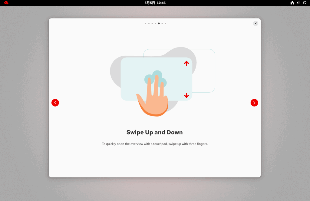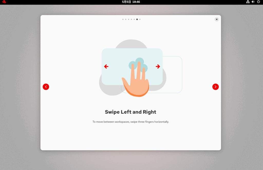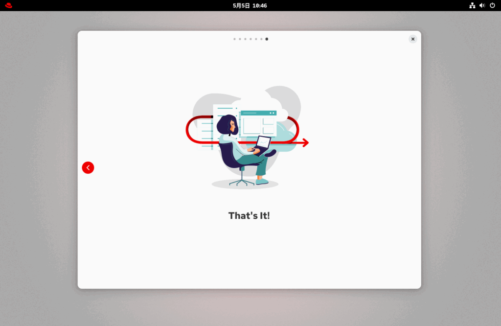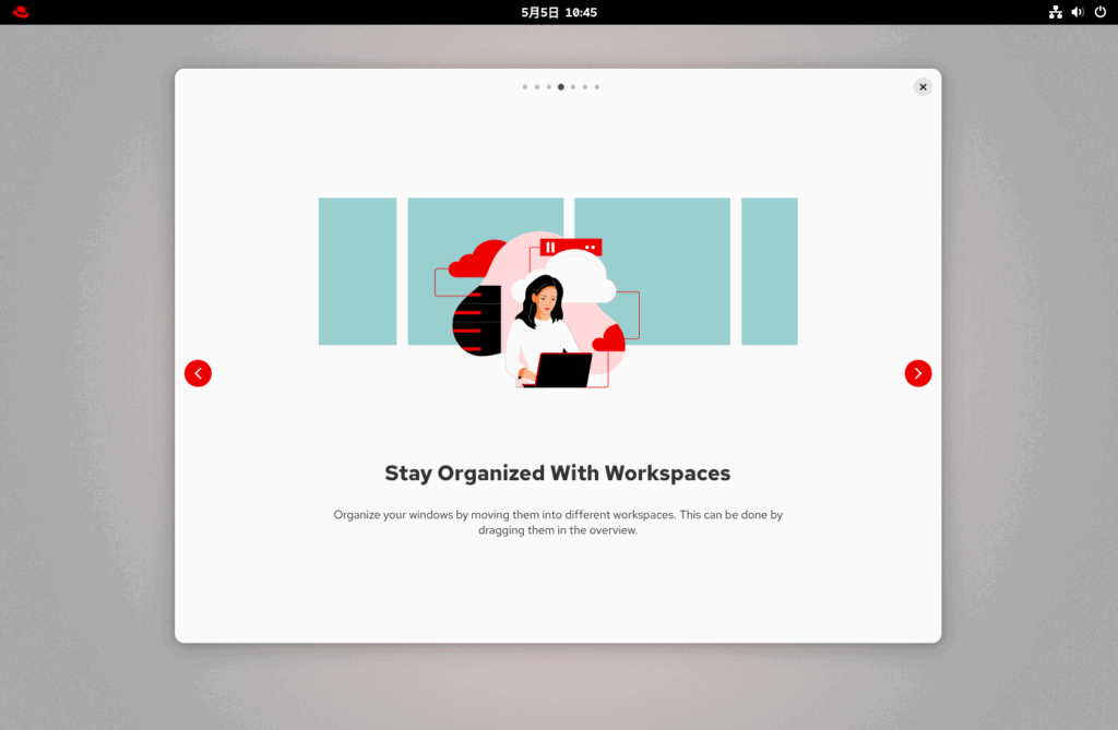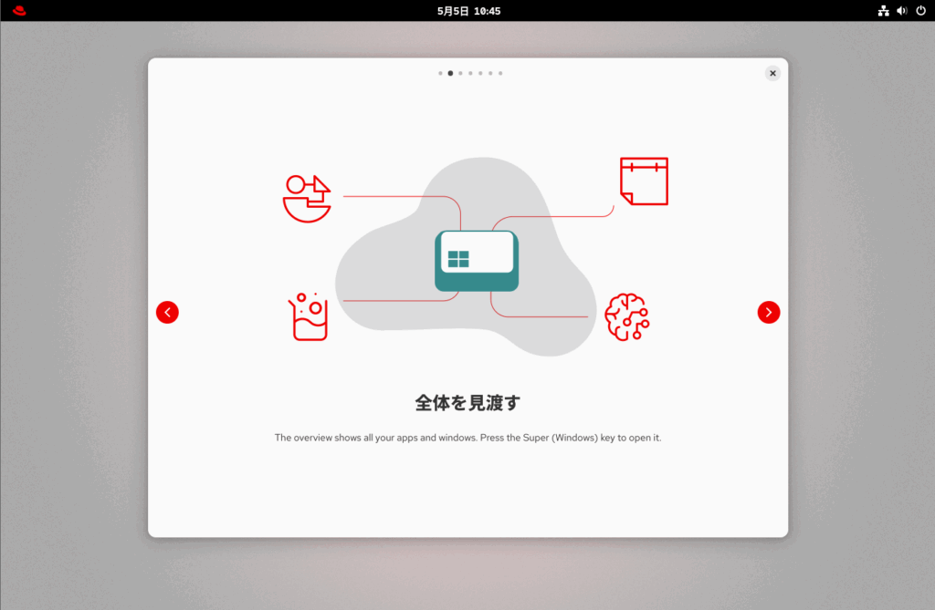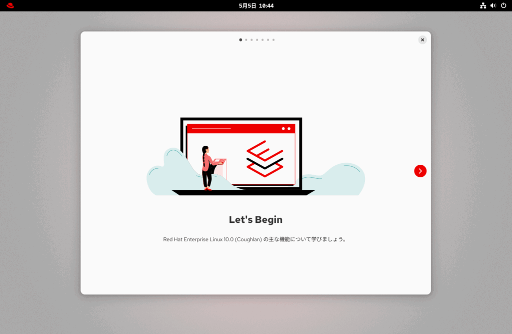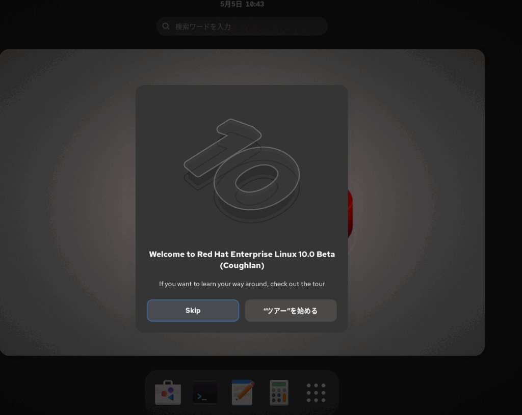 Skipをクリックしたいところですが、RHEL10からの新機能等を確認するため、ツアーを始めるをクリックします。