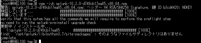 [root@RHEL100 tmp]# rpm -ivh splunk-10.2.0-d749cb17ea65.x86_64.rpm