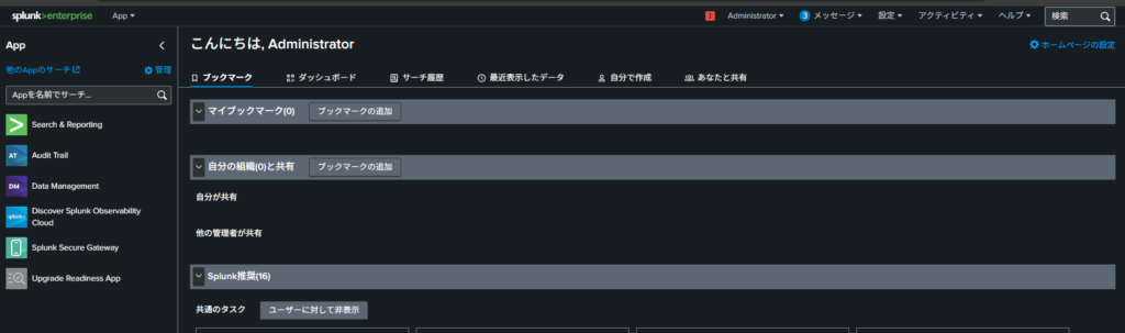 ブラウザからhttp://<今回設定したLinuxのSplnkサーバーのIPアドレス>:8000にアクセスします。以下の画面が表示されたら、/opt/splunk/bin/splunk start –accept-license –run-as-rootコマンド実行時に作成したユーザーとパスワードでログインします。