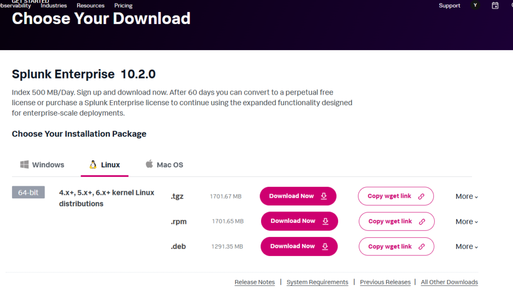 まずは以下のSplunk公式サイトからSplunkをインストールするためのrpmパッケージをダウンロードします。