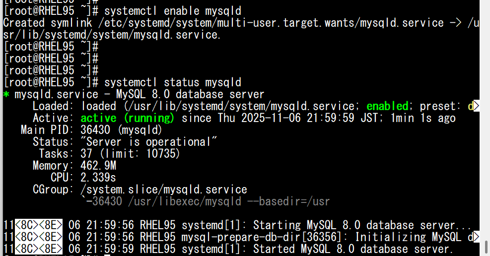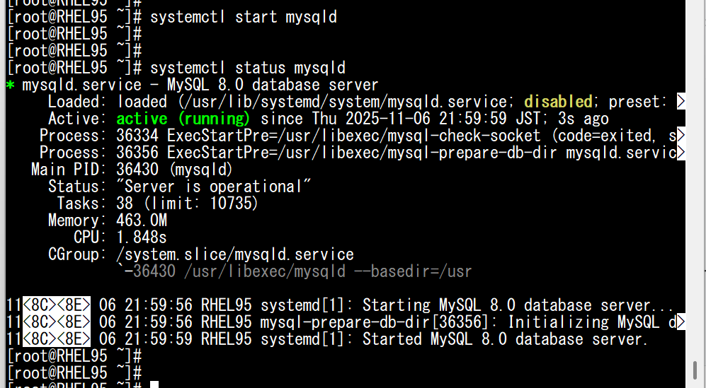 11<8C><8E> 06 21:59:59 RHEL95 systemd[1]: Started MySQL 8.0 database server.