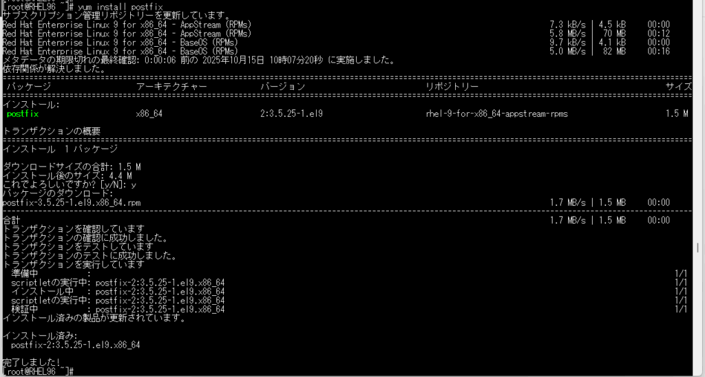 Red Hat Enterprise Linux 9.6にPostafixをyumコマンドでインストールした作業証跡を紹介します。