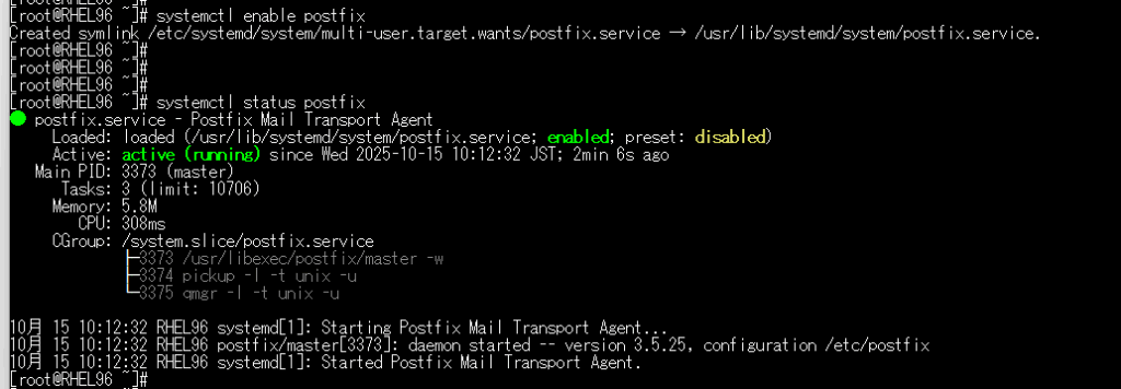 systemctl enable postfixコマンドを実行して、OS起動時にpostfixが自動起動するようにしておきます。