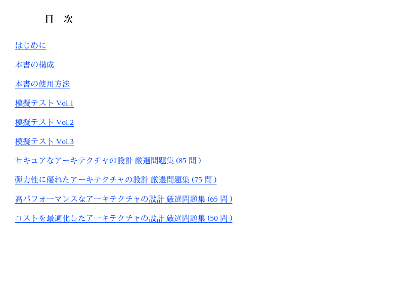次のページから模擬問題が始まります。 カテゴリ別問題から解く方は、目次からジャンプしてください。唯本堂 (Yuihondo). 2週間で合格!AWS認定資格 ソリューションアーキテクト アソシエイト【SAA-C03 対応】 (唯本堂 (Yuihondo)) (p.7). Kindle 版.