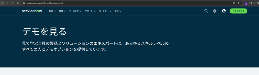 実際の仕事で使用したい場合は右上の今すぐ始めるをクリックして問い合わせることでService Nowを導入します。