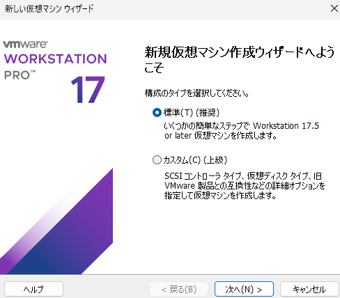.isoファイルをVMware Workstation上にインストールして新規仮想マシンを作成します。