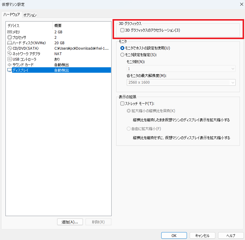 RHEL10.0をVMware workstationにインストールするには仮想マシンの設定から3D グラフィックスのアクセラレーション設定を無効化します。