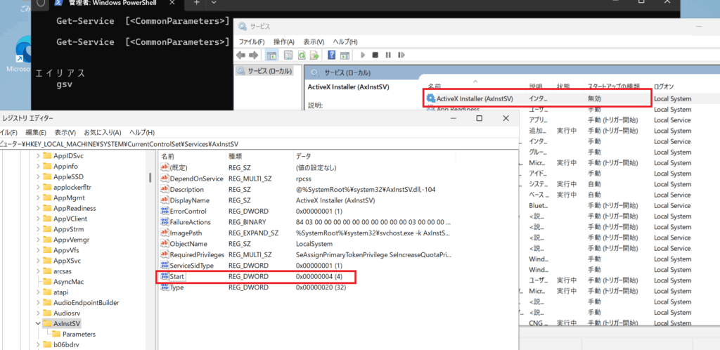 レジストリキーを変更すると、AxInstSVの例ではすぐにサービスの無効化が反映されました。サービスによってはレジストリキーからの反映には再起動が必要な場合がある可能性があるため検証やMicrosoftのサポートへの確認が必要です。