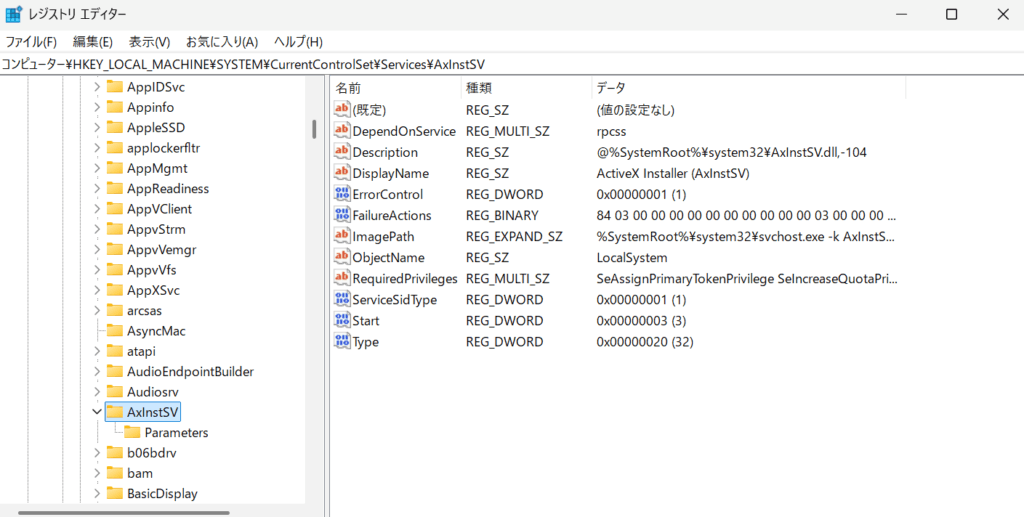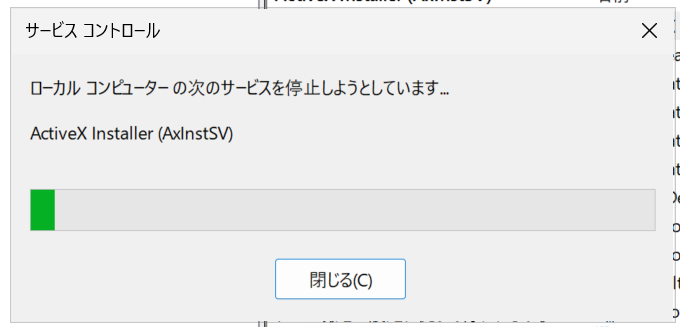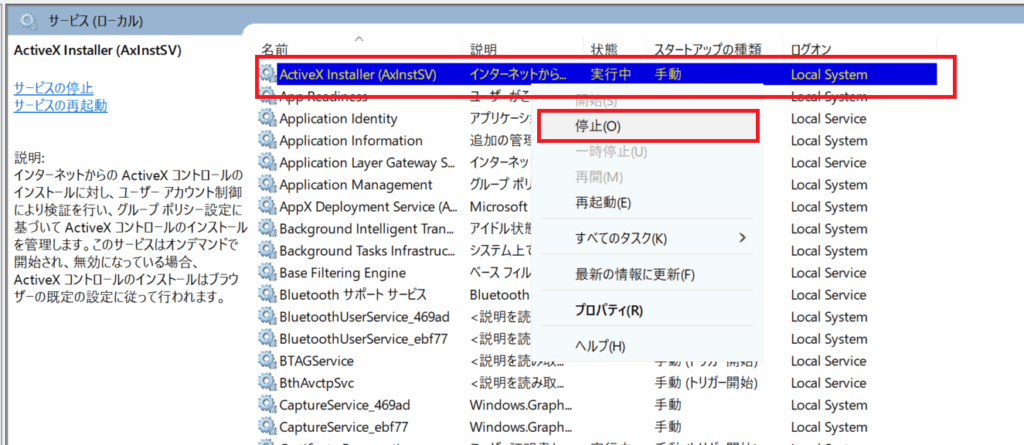 ActiveX インストーラー (AxInstSV)を例に、サービスを停止してみます。
