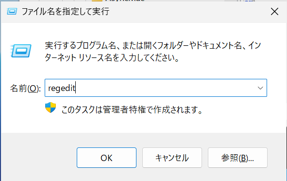 WindowsキーとRキーを同時に押下して「regedit」と入力し、OKボタンを押下してレジストリエディタを立ち上げます。